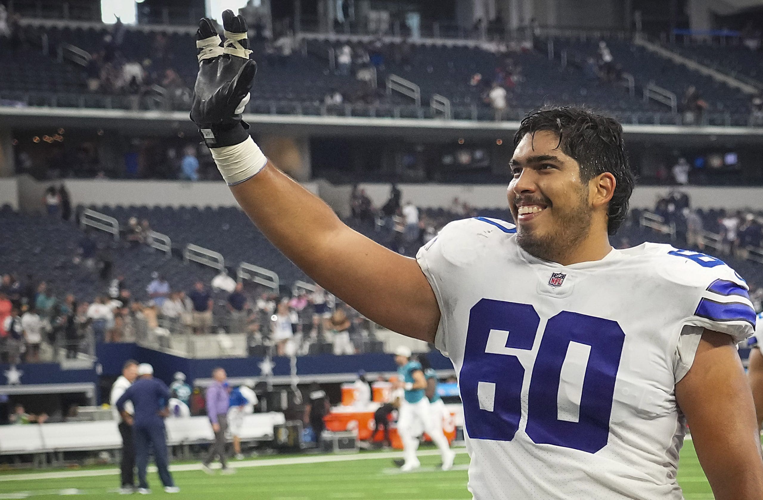 Dallas Cowboys offensive tackle Isaac Alarcon waves to the crowd as he leaves the field following a loss to the Jacksonville Jaguars in a preseason NFL football game at AT&T Stadium on Sunday, Aug. 29, 2021, in Arlington. (Smiley N. Pool/The Dallas Morning News)